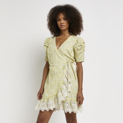 Yellow Floral Wrap Mini Dress River Island